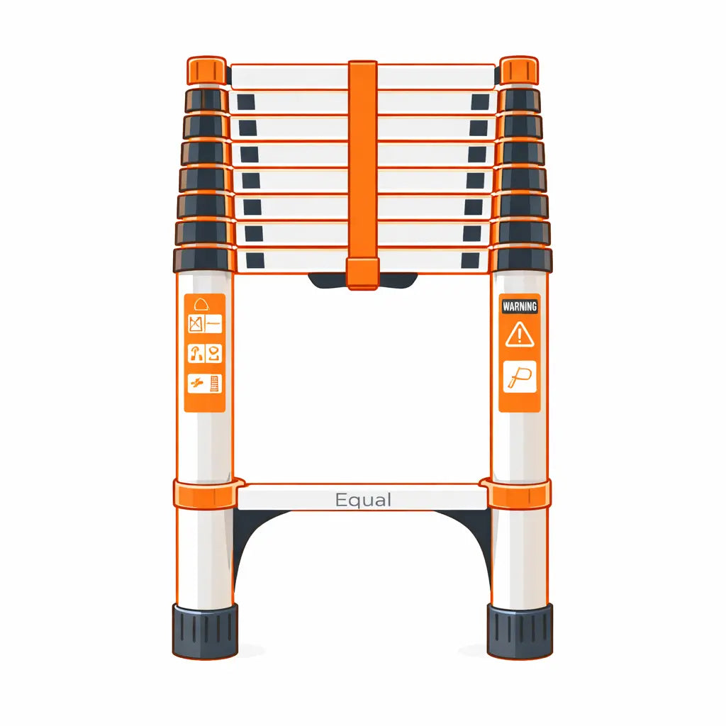 A telescopic ladder extends rung by rung using auto-lock mechanisms. Pull sections upward — each rung clicks and locks automatically. To collapse, press the release buttons one section at a time. You can set it at any height between fully collapsed and fully extended.
