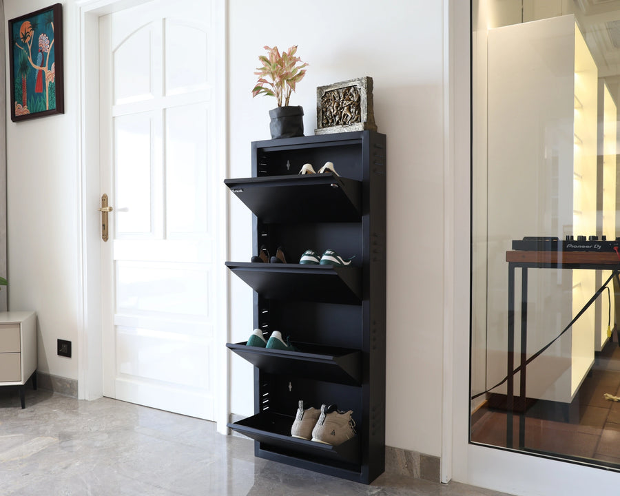 Organise your footwear efficiently with the Equal 4-Shelf Lite Metal Shoe Rack for Home, an economic and space-saving shoe storage solution designed for everyday use. Made from powder-coated heavy-duty mild steel, this shoe cabinet is rust-proof, durable, and finished in a modern matte black colour that suits both contemporary and minimal interiors.